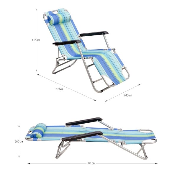 Je to ideálny spoločník na výlety na pláž, ale samozrejme sa bude hodiť aj na záhrade alebo pri kempovaní. Je to všestranné lehátko, ktoré obstojí v akýchkoľvek podmienkach a v akomkoľvek teréne. Model je skladací, takže si ho môžete ľahko vziať so sebou na cesty. Lehátko sa dá nastaviť do dvoch polôh. Prvou je poloha ležmo, ktorá vám dáva možnosť opaľovať sa na chrbte aj na bruchu. Atraktívna poloha najmä pre tých, ktorí neradi ležia priamo na piesku. Druhá poloha je v sede. Je vhodná na opaľovanie, ale dá sa použiť aj pri kempingovom stole. Okrem pohodlia v oboch polohách je tu aj vankúš, ktorý môžete posúvať a prispôsobovať svojim potrebám.