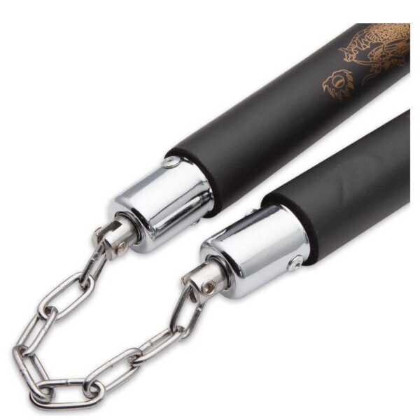 Nunchaky, čiže nunčaky sú vďaka penovým rukovätiam určené k tréningu bojových umení. Vysoká vrstva peny znižuje riziko zranenia. Oceľové valčeky sú opatrené ložiskami a spojené zváranou reťazou.