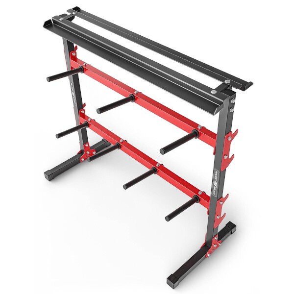 Vrchná časť stojanu je 106 centimetrov dlhá polica pre odkladanie jedno-ručných činiek.